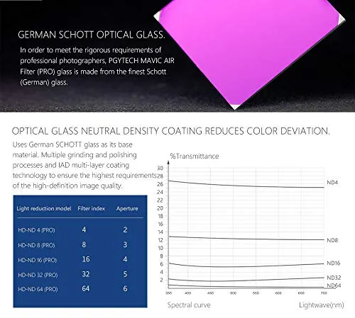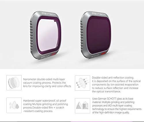 Cada filtro pesa solo 0.8 a 1.2 gramos y no afecta el rendimiento de la cámara o el rango de vuelo. Además, el filtro es resistente al agua y al aceite gracias a su construcción con vidrio Schott alemán y tecnología de recubrimiento de capas múltiples IAD.