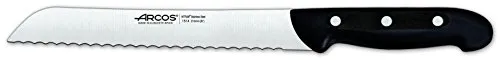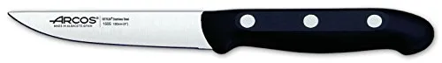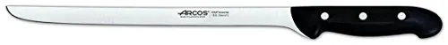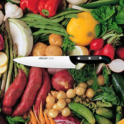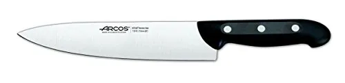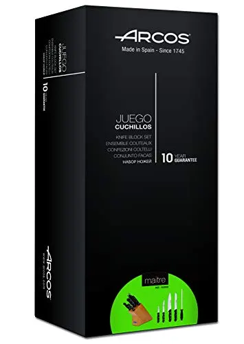 El juego de cuchillos Arcos Maitre es la elección perfecta para aquellos que buscan un conjunto de cuchillos de alta calidad para el uso diario en la cocina. Este juego incluye 4 cuchillos de cocina y 1 tijera de cocina, todos fabricados con acero inoxidable NITRUM, una fórmula de Arcos que proporciona una hoja de acero al nitrógeno de alta dureza y durabilidad del filo. Los mangos están fabricados en polipropileno (PP), un material plástico de alta resistencia mecánica, poco peso y buen acabado superficial. Además, los remaches machihembrados de acero inoxidable garantizan la alta resistencia a la corrosión. Este juego de cuchillos viene en un taco de madera en una caja de regalo, lo que lo convierte en una excelente opción para regalar. Fabricado 100% en España, este juego de cuchillos Arcos Maitre viene con una garantía de 10 años contra todo defecto de fabricación.